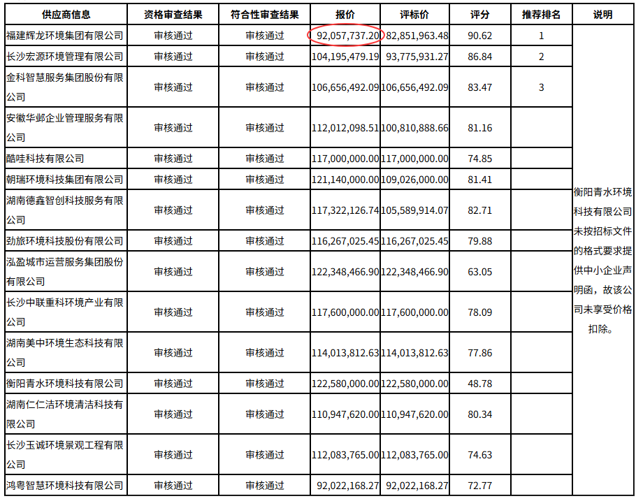 项目招标于2025年07月28日结束,中标公告显示,福建辉龙环境集团有限公司以92057737.20元,评分第一名中标该项目,较招标预算低了3千万。