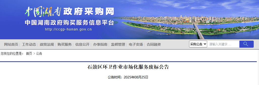 ]article_adlist-->#北极星固废网获悉,8月25日,湖南省政府采购网发布石鼓区环卫作业市场化服务废标公告。
